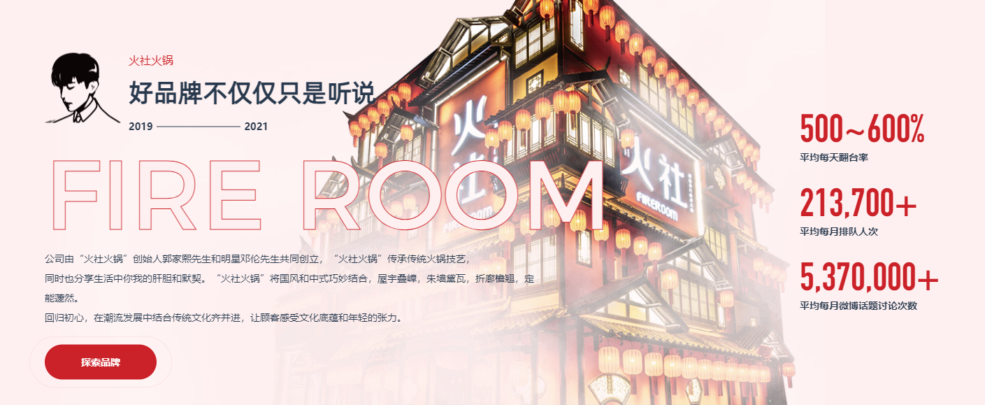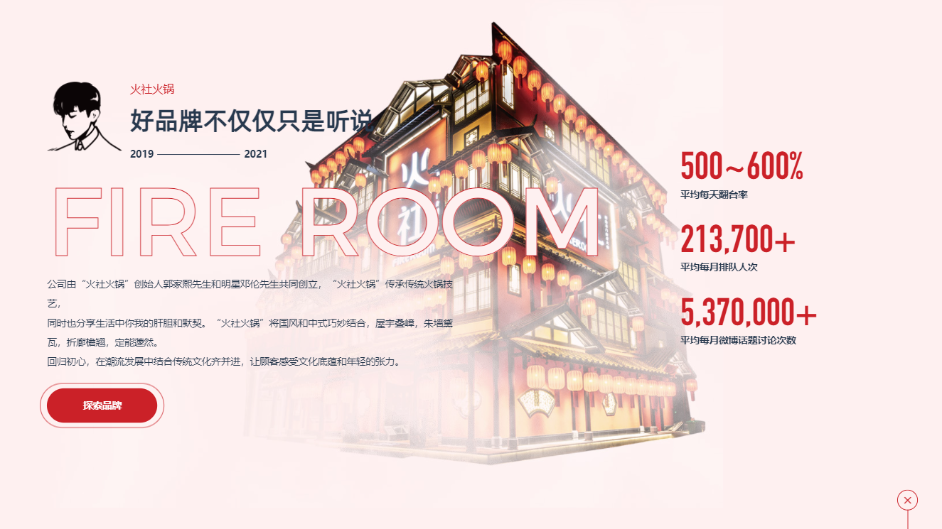 (我們將火社火鍋旗艦店的輪廓摳出來,融合在整個背景里面,在不干擾用戶閱讀品牌介紹和關鍵數據的同時,讓門店線下的裝修風格和線上網頁達到一個契合↑)