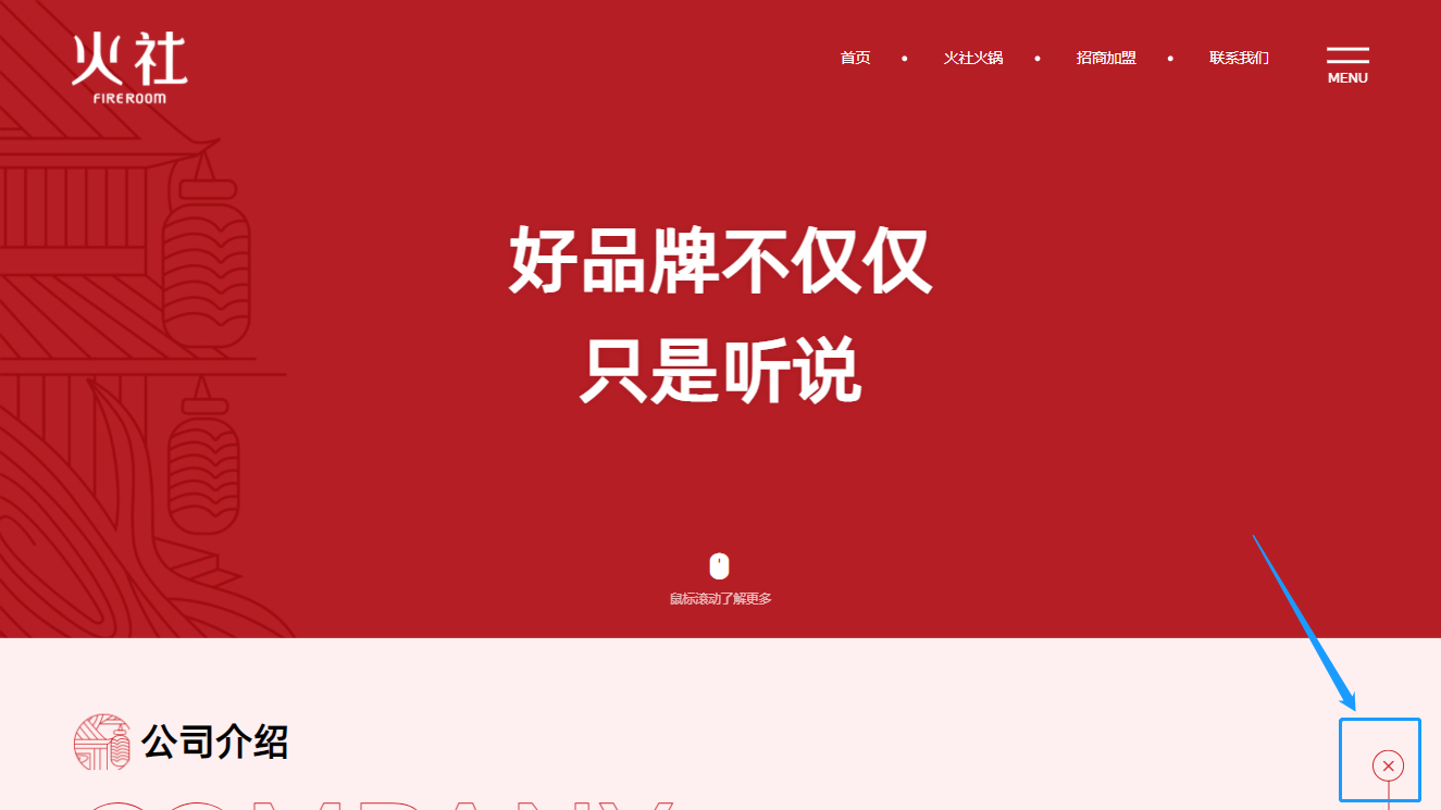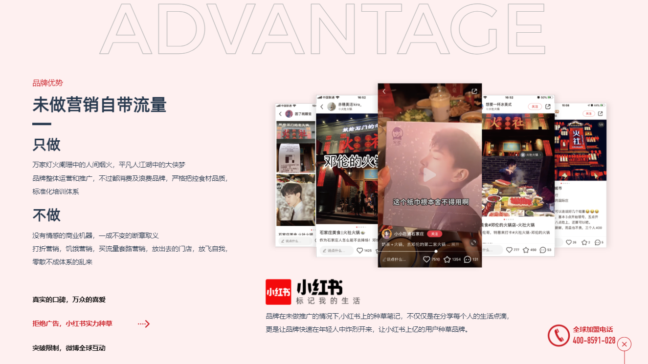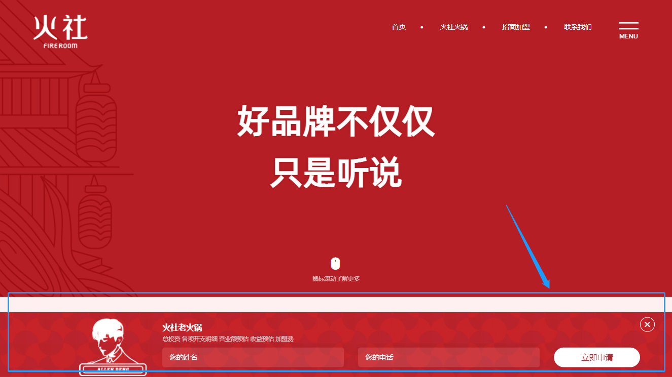 (愛蜀美極度注重用戶瀏覽網頁的舒適度和不被打擾性,非常反感一些營銷工具的強制彈窗、反復彈出、狗皮膏藥似的占滿屏幕的四周,只保留必要的咨詢通道。所以我們只在網頁底部加入了一個加盟窗口,用戶可以隨時收縮/打開窗口,在尊重用戶體驗感的情況下,也體現了火社火鍋把服務放在首位的品牌理念↑)