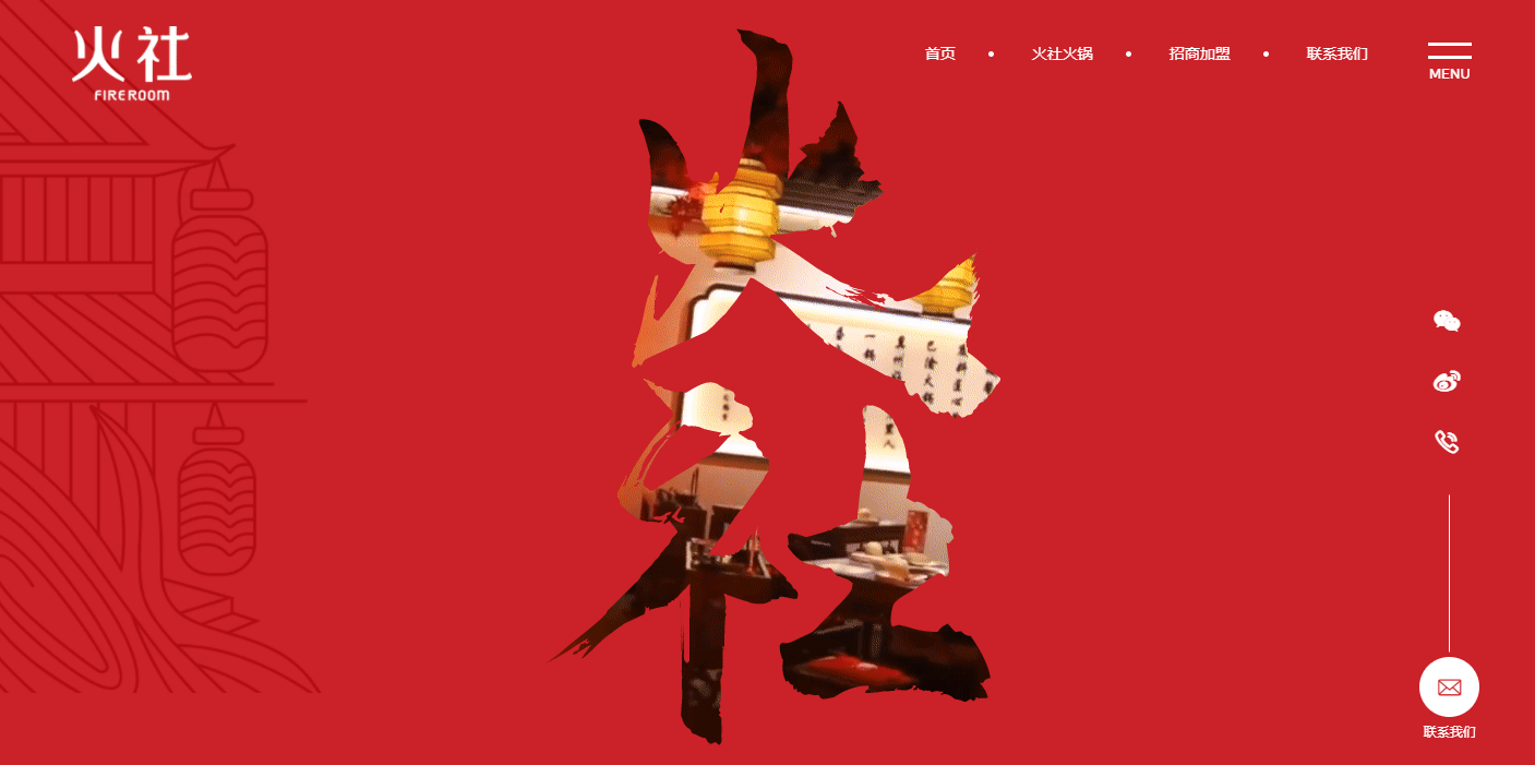 (整個首頁作為品牌宣傳頁面,突出火社火鍋品牌,一下就讓用戶的視覺聚焦,沒有其他多余的元素干擾↑)